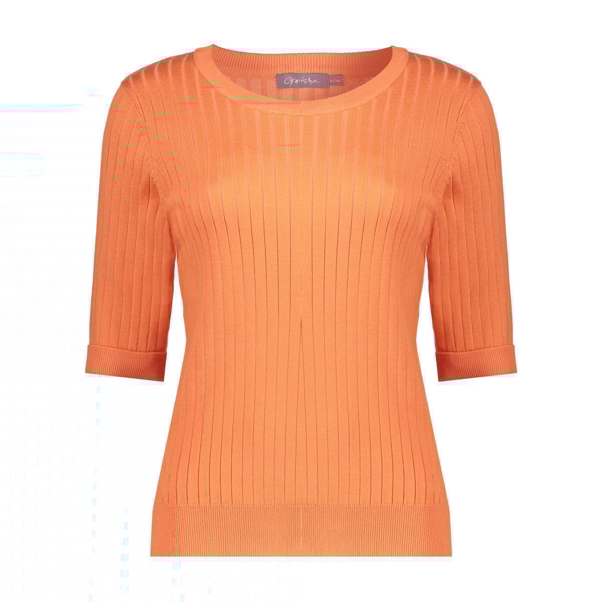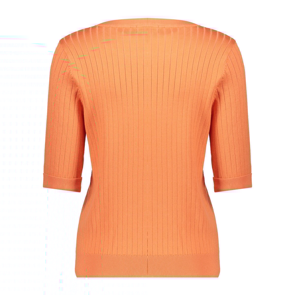 Deze top uit onze S26-1 collectie is uitgevoerd in een frisse oranje tint en gebreid in een fijne ribstructuur die mooi aansluit. De ronde hals en korte mouwen geven het ontwerp een tijdloze uitstraling, terwijl de zachte kwaliteit prettig draagt. Een veelzijdige knit die makkelijk combineert met denim of een elegante broek voor dag en avond.